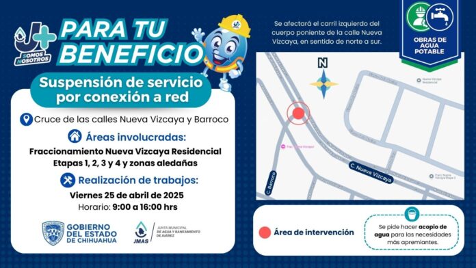 Por tal motivo, entre las 9:00 y las 16:00 horas de mañana, se impactará la prestación del servicio en el fraccionamiento Nueva Vizcaya Residencial, etapas 1, 2, 3 y 4, así como en zonas aledañas.