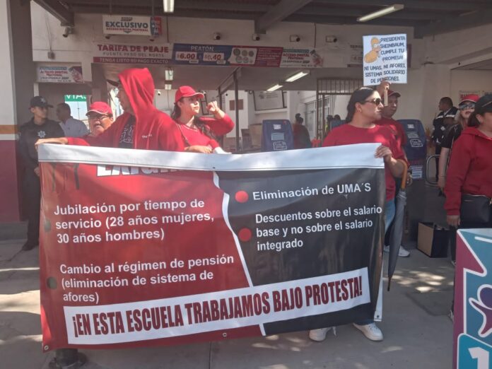 Ciudad Juárez, Chih (ADN/Arturo Hernández) .– Alrededor de 150 miembros de Resistencia Magisterial tomaron los puentes internacionales de la calle Juárez y de Zaragoza, para exigir al gobierno federal la derogación de la Ley del ISSSTE del 2007.