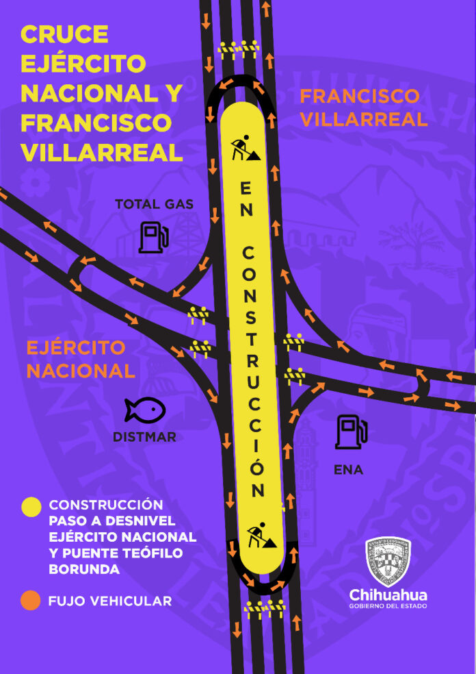 Ciudad Juárez, Chih.- El Fideicomiso de Puentes Fronterizos de Chihuahua informa sobre las vías de circulación que se estarán usando en la intersección de Francisco Villarreal Torres y Ejército Nacional, debido a los trabajos de reconstrucción en los carriles laterales.
