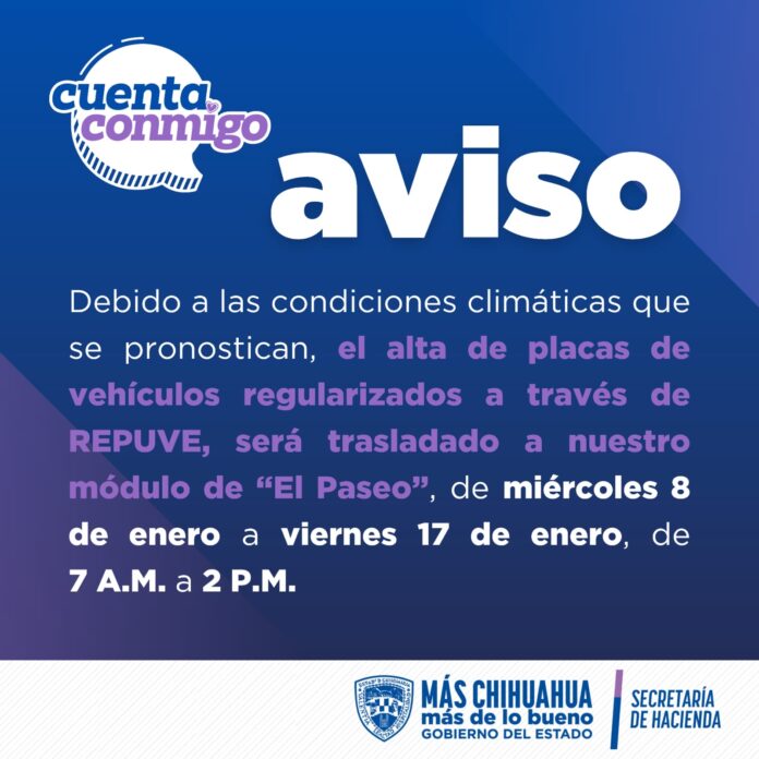 Con el objetivo de proteger a los contribuyentes de las inclemencias del clima, la Secretaría de Hacienda informó que el trámite de alta de placas se trasladará temporalmente del módulo Estadio Juárez al módulo El Paseo desde el 8 de enero hasta el 17 de enero, en un horario de 7 de la mañana a 2 de la tarde.