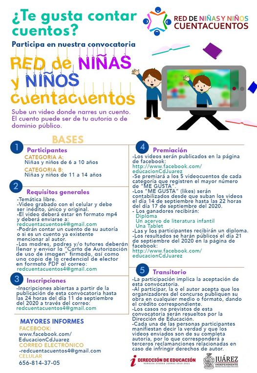 Ciudad Juárez, Chih. – A través de la Dirección de Educación invitan a infantes a participar en la Red de Niñas y Niños Cuenta-cuentos, la convocatoria termina el 11 de septiembre y los ganadores se darán a conocer el 21 del mes en curso.