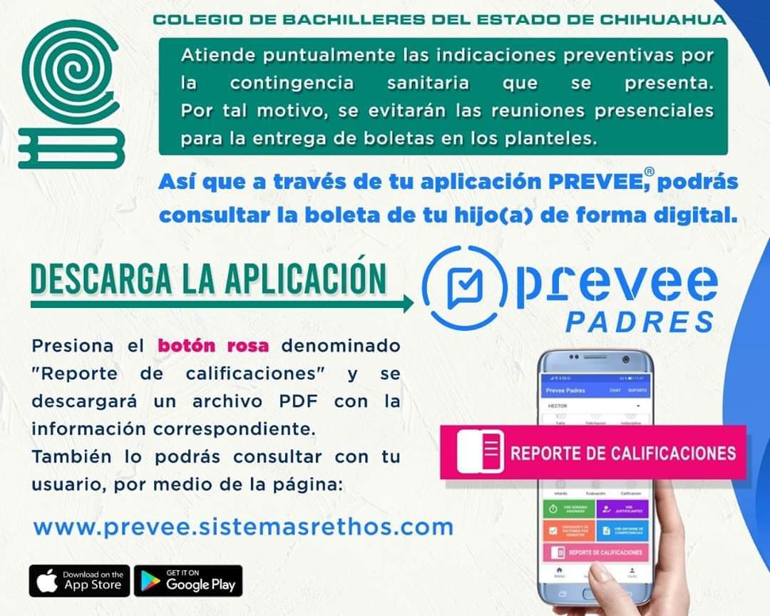 Ciudad Juárez, Chih. – Acatando las disposiciones de la Secretaría de Salud para prevenir el Covid-19; el Colegio de Bachilleres en la Zona Norte exhorta a los padres de familia y alumnos a conocer las calificaciones del primer bimestre del presente ciclo escolar, de manera digital a través de una aplicación en el celular.