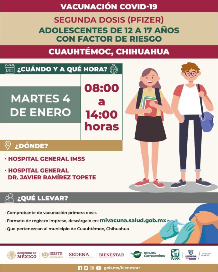 En Ciudad Juárez, continuó, la segunda dosis de Pfizer para adolescentes de 12 a 17 años con comorbilidades se administrará en el Hospital General Regional 66 del IMSS, así como en el Hospital Infantil de Especialidades, en un horario de 08:00 a 14:00 horas.