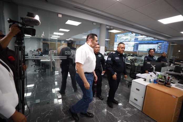 El alcalde estuvo acompañado del secretario de Seguridad Pública Municipal, César Omar Muñoz Morales, quien le mostró las diferentes áreas donde se da respuesta a las llamadas de emergencia de la ciudadanía al teléfono 911 y la vigilancia con las 276 cámaras que operan en la ciudad.