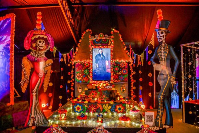 Las ofrendas incluyen elementos característicos de esta tradición como flores de cempasúchil, papel picado, veladoras, fotografías, alimentos y objetos alusivos a los personajes conmemorados.