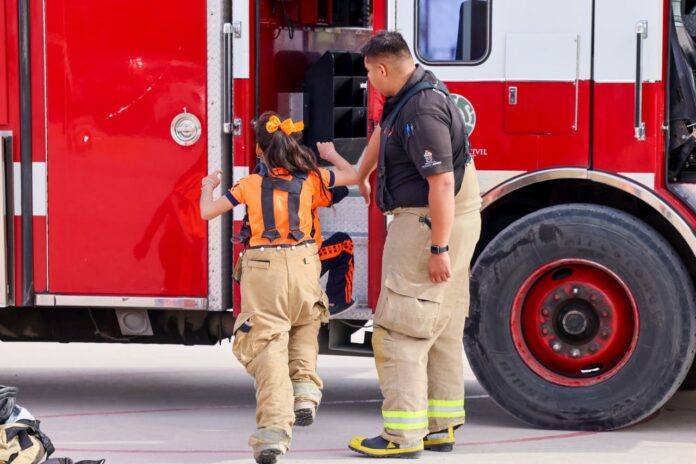 Niñas y niños de la Escuela Primaria “José Santos Valdez” se convirtieron en bomberos por un día, durante la realización del programa Cruzando Sonrisas, del Sistema para el Desarrollo Integral de la Familia del Municipio de Juárez (DIF).