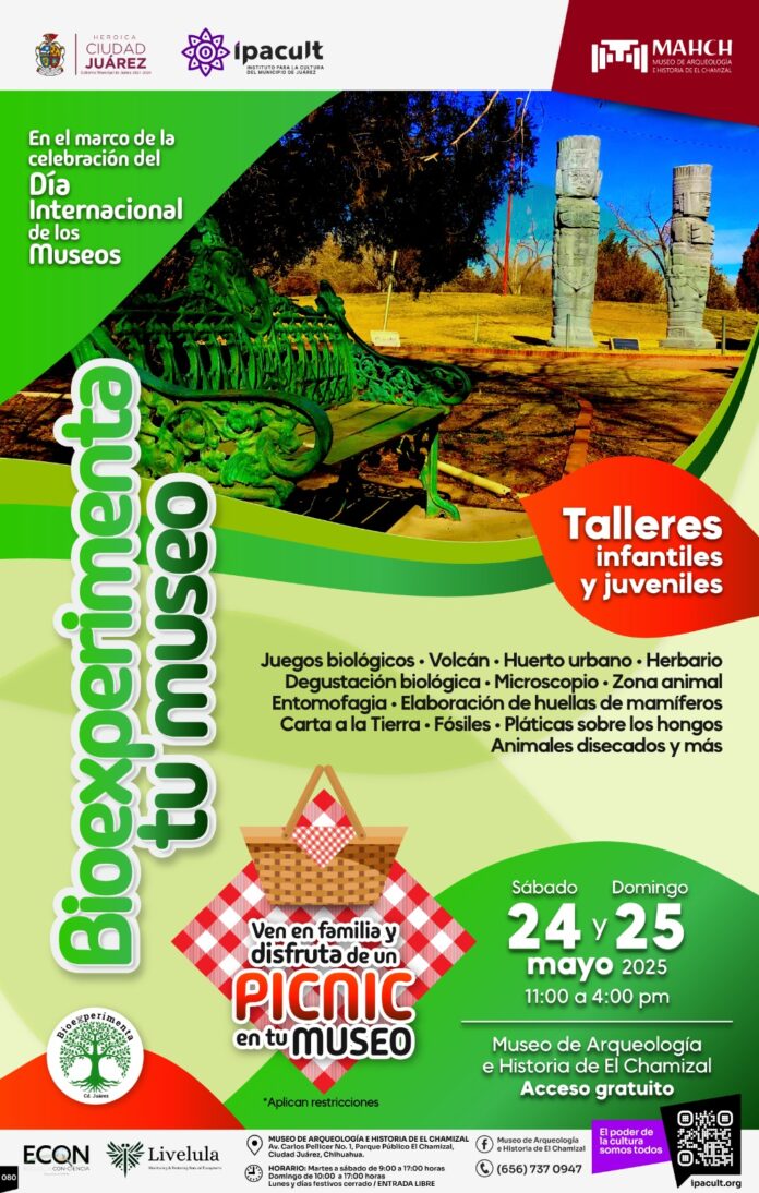 Este fin de semana, el Instituto para la Cultura del Municipio de Juárez (IPACULT) ofrece una alternativa única de aprendizaje y convivencia con “Bioexperimenta tu Museo”, un evento que se llevará a cabo el sábado 24 y domingo 25 de mayo a partir de las 11:00 de la mañana en el Museo de Arqueología e Historia de El Chamizal (MAHCH).