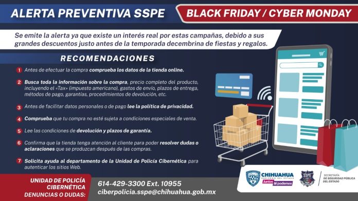 Chihuahua, Chih .- La Secretaría de Seguridad Pública del Estado (SSPE), a través de la Unidad de Policía Cibernética, lanzó una alerta preventiva para todos los consumidores de la estrategia comercial Black Friday y del Ciber Monday, especialmente para aquellos que compran en línea.