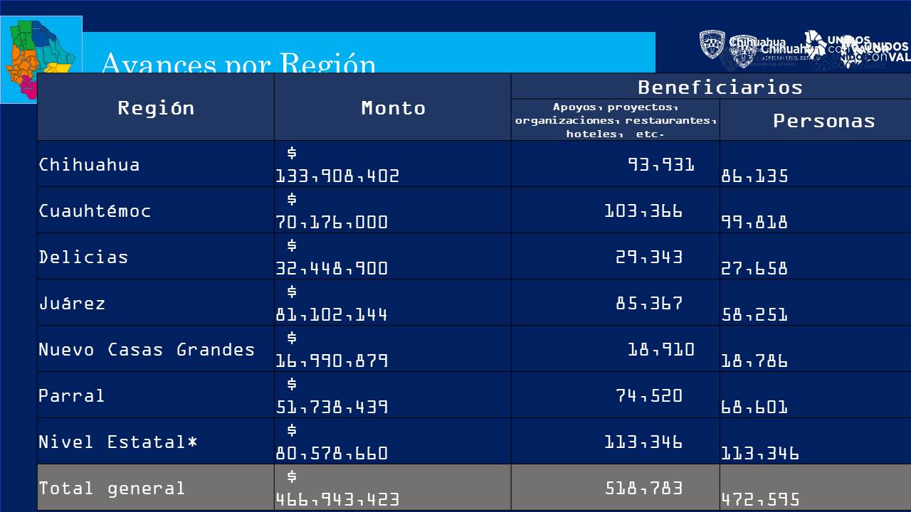 Chihuahua, Chih. – El gobernador Javier Corral informó que a la fecha se dispersaron 466 millones 943 mil 423 pesos en 518 mil 783 acciones de apoyo directo a proyectos, organizaciones, restaurantes, hoteles, entre otros, en beneficio de 472 mil 595 personas pertenecientes a las seis regiones en las que se dividió la entidad: Chihuahua, Juárez, Delicias, Cuauhtémoc, Parral y Nuevo Casas Grandes.