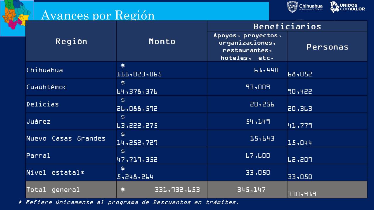 Chihuahua, Chih. – A la fecha se han dispersado 331 millones 932 mil 653 pesos en 345 mil 147 acciones de apoyo directo a proyectos, organizaciones, restaurantes y hoteles, entre otros, en beneficio de 330 mil 919 personas pertenecientes a las seis regiones en las que se dividió la entidad: Chihuahua, Juárez, Delicias, Cuauhtémoc, Parral y Nuevo Casas Grandes.