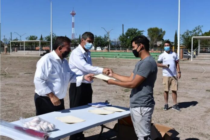 En una sencilla ceremonia en la que se respetaron todas las medidas de seguridad ante la contingencia sanitaria por el COVID-19, fueron entregados los permisos correspondientes para el uso del campo deportivo al representante del equipo “Club 13”, al representante de la escuela de fútbol “Ángel Aguilar” y al representante de la liga “Veteranos”.