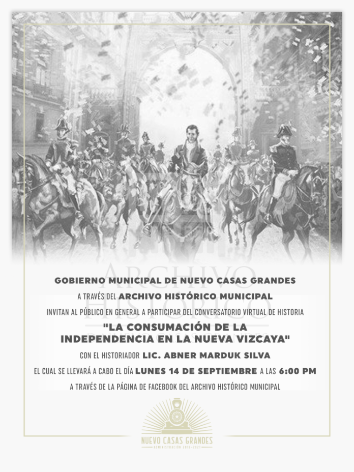 La Presidencia Municipal de Nuevo Casas Grandes a través del Archivo Histórico, ofrecerá este lunes 14 de septiembre la conferencia virtual “La Consumación de la Independencia en la Nueva Vizcaya”, a cargo del historiador Marduk Silva en punto de las 18:00 horas.