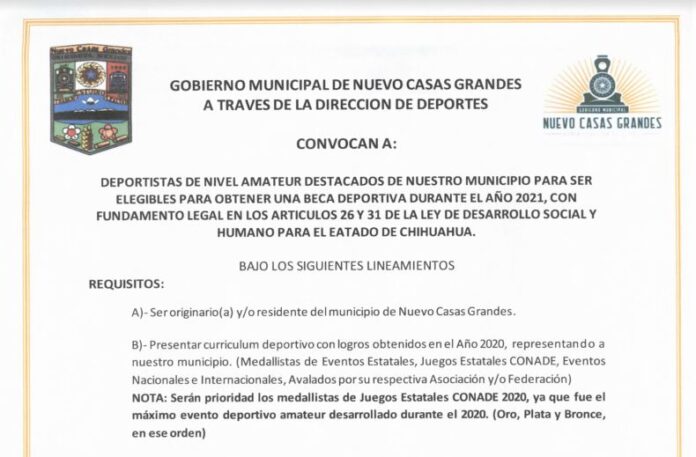 Para los deportistas de nivel amateur que quieran ser elegibles para recibir un beca económica durante el 2021, los requisitos son: ser originarios del municipio de Nuevo Casas Grandes y presentar su currículum con los logros obtenidos durante el 2020.