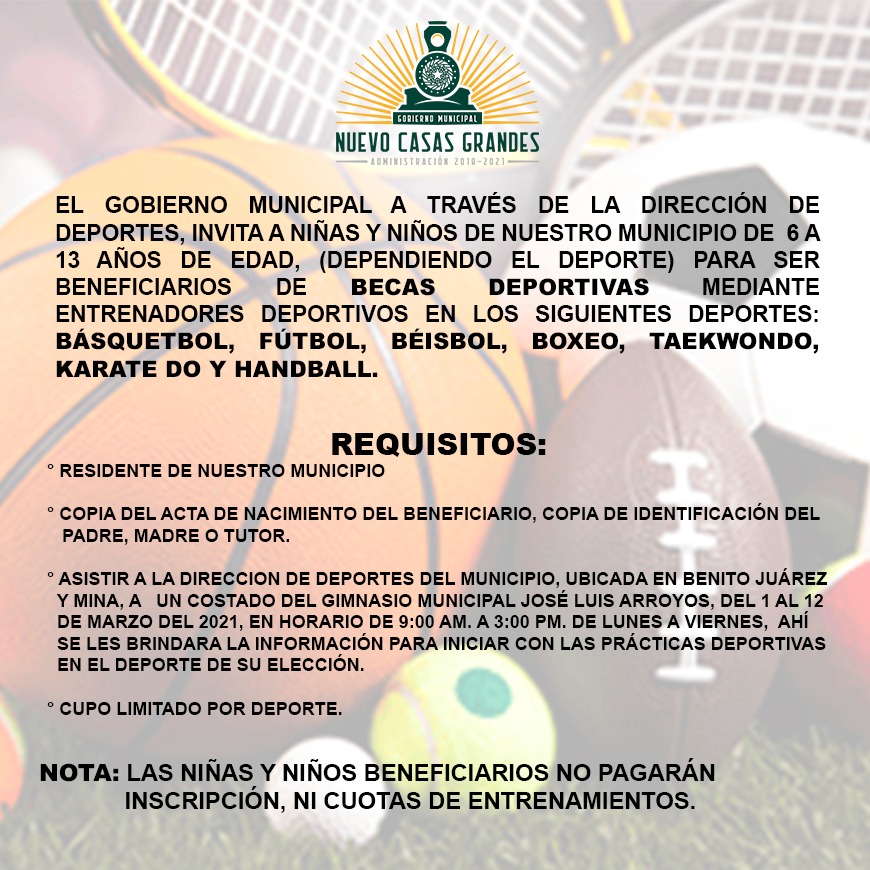 Nuevo Casas Grandes, Chih. – La Presidencia Municipal de Nuevo Casas Grandes a través de la dirección de Deportes, invita a niños y niñas que tengan interés en ser beneficiarios de becas deportivas en las disciplinas deportivas de: básquetbol, futbol, béisbol, boxeo, taekwondo, karate do y handball, a entregar la documentación y solicitud del 1 al 12 de marzo del presente año.