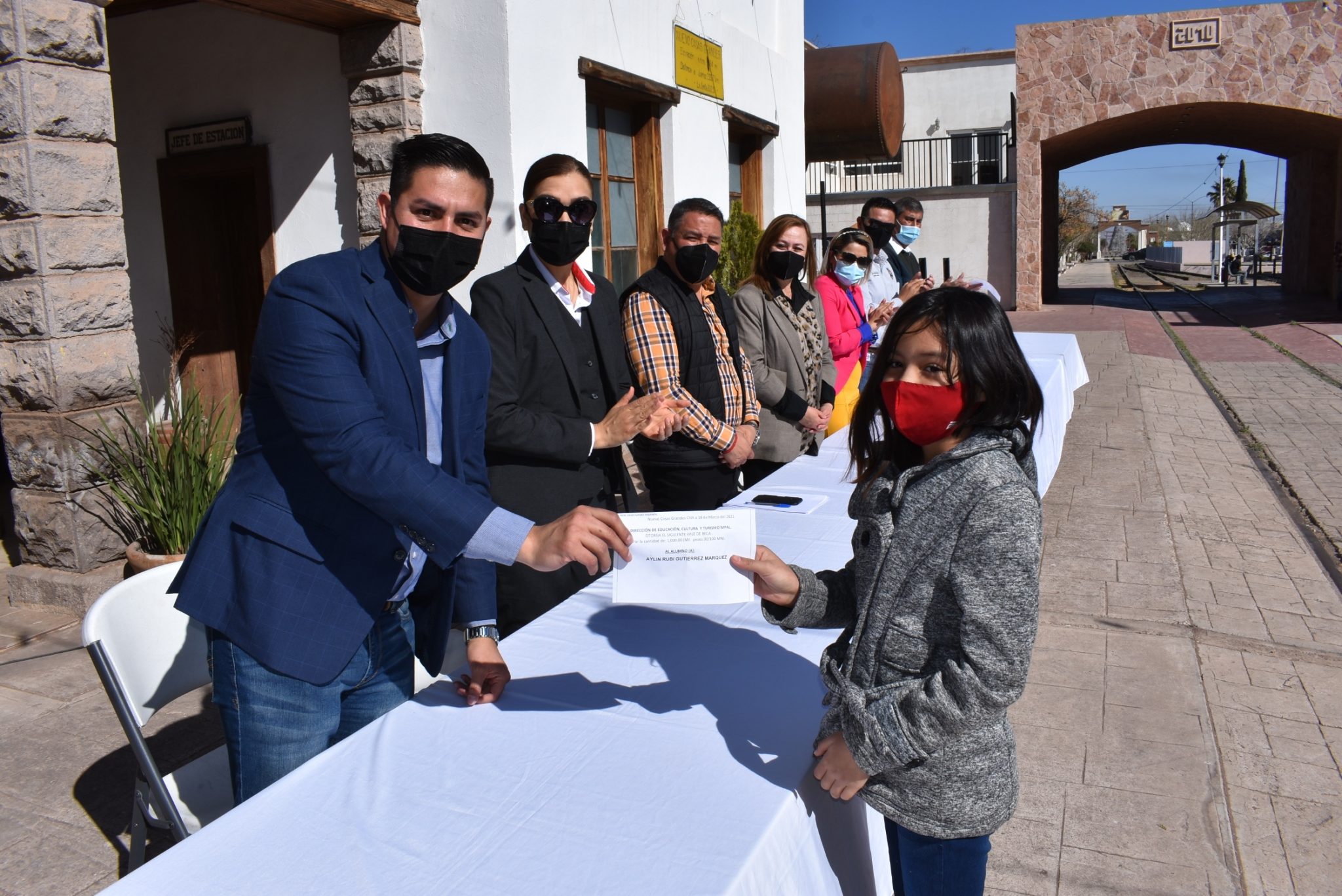 Debido a las restricciones para reuniones masivas de personas por el Covid-19, se llevó a cabo de manera simbólica la entrega de las becas en la explanada de la Casa de la Cultura, en donde se contó con la presencia de algunos de los estudiantes beneficiados, quienes en todo momento utilizaron su cubrebocas y mantuvieron la sana distancia.
