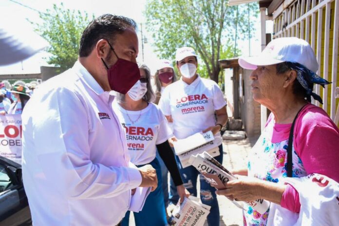 Juan Carlos Loera, candidato a la gubernatura por la Coalición Juntos Haremos Historia en Chihuahua (Morena, PT y Nueva Alianza), recorrió las calles sin pavimentar de la colonia Héroes de la Reforma del municipio de Nuevo Casas Grandes, Chihuahua.