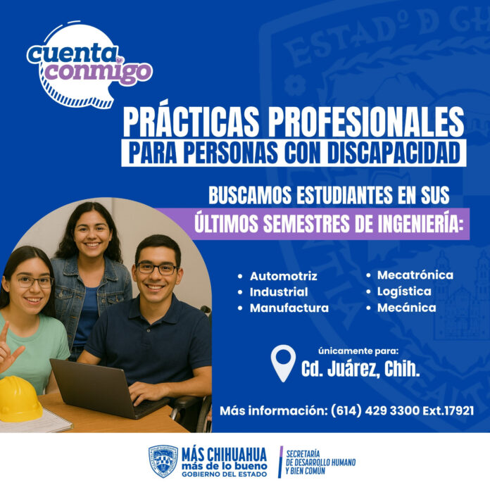 Ciudad Juárez, Chih .- El Gobierno del Estado, a través de la Secretaría de Desarrollo Humano y Bien Común (SDHyBC) invita a estudiantes con discapacidad, a participar en el programa de prácticas profesionales en empresas reconocidas de Ciudad Juárez.