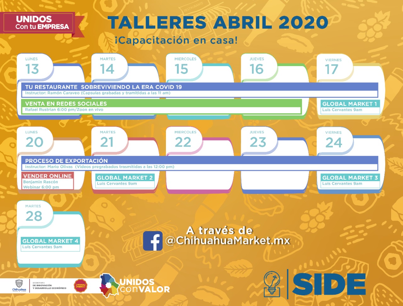 Chihuahua, Chih. – Como parte de las acciones implementadas por el Gobierno del Estado para hacer frente a la crisis económica por la contingencia del COVID-19, la Secretaría de Innovación y Desarrollo Económico (SIDE), invita a las capacitaciones y asesorías que se brindan durante el mes de abril en forma virtual y gratuita.
