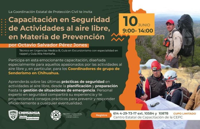 La Coordinación Estatal de Protección Civil (CEPC) invita a la comunidad a participar en la capacitación en Seguridad de Actividades al aire libre, en Materia de Prevención, que se realizará el próximo sábado 10 de junio, desde las 9:00 hasta las 14:00 horas en el Centro Estatal de Capacitación de la dependencia.