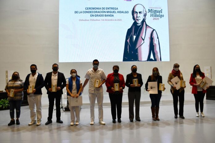 Chihuahua, Chih .- Un total de 120 personas que laboran en los hospitales COVID-19 pertenecientes a la Secretaría de Salud Chihuahua, recibieron este jueves la Condecoración Miguel Hidalgo Grado Banda, por las conductas ejemplares que mostraron durante la emergencia sanitaria.