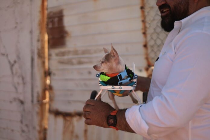 Parral, Chih.- El candidato a diputado por Movimiento Ciudadano, Francisco Sánchez, entregó una silla de ruedas para Abejita, una perrita con discapacidad en la ciudad de Parral.