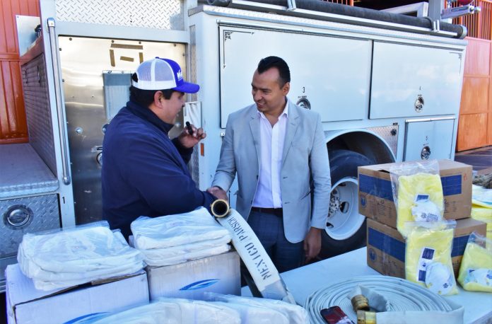 Parral, Chih .– Este martes, en la Estación de Bomberos de Parral, el alcalde César Peña Valles llevó a cabo la entrega de equipamiento para la unidad de Bomberos del vecino Municipio de Matamoros, el cual fue recibido por su homólogo Jesús Enrique Peña Vázquez, quien agradeció el apoyo y el trabajo hermanado entre ambas corporaciones.