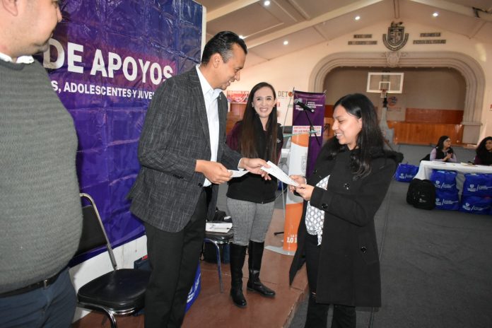 Parral, Chih .- Esta mañana el alcalde César Peña Valles y Karla Trejo López, Directora de Desarrollo Humano e Inclusión Social de Gobierno del Estado, llevaron a cabo la entrega conjunta de apoyos previamente gestionados ante la referida dependencia en beneficio de 225 jóvenes y niños que recibieron un monto global de 690 mil pesos.