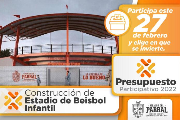 Parral, Chih .- Dentro de las cinco opciones de obra que podrás elegir este 27 de febrero en la VI edición el Presupuesto Participativo 2022, se incluye un nuevo Estadio para el desarrollo de los nuevos talentos del béisbol en Parral cuyas glorias deportivas están estrechamente ligadas al Rey de los Deportes.
