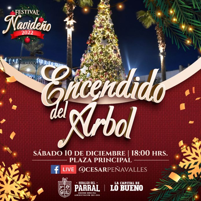 Parral, Chih .- El alcalde César Peña Valles invitó a la ciudadanía para que este sábado 10 de diciembre no se pierda el tradicional encendido del Árbol Navideño que se realizará en la plaza Principal a partir de las 18:00 horas, en donde se ofrecerá un bonito espectáculo para las y los asistentes.