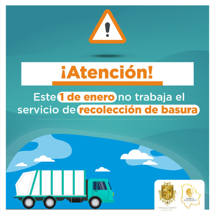 Hidalgo del Parral, Chih. – El Gobierno de Parral anuncia, que el próximo viernes 1 de enero de 2021 el servicio de recolección de basura no laborará, por lo que se invita a la ciudadanía a no sacar sus desechos a la vía pública.