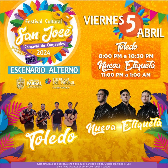 Parral, Chih .- Este viernes, en el marco del Festival Cultural San José “Carnaval de Carnavales”, Parral se prepara para una jornada llena de diversión y baile con el esperado desfile de Comparsas y las presentaciones de Hernán “El Potro” y la Sonora La Lagunera.