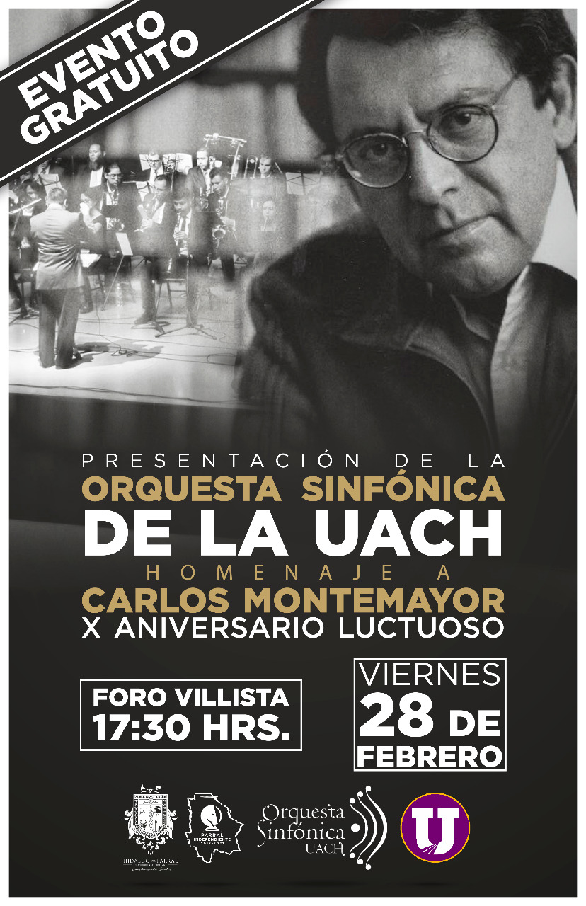 Hidalgo del Parral, Chih. – El próximo viernes 28 de febrero se llevará a cabo la presentación de la Sinfónica de la Universidad Autónoma de Chihuahua (UACH), evento que se realiza en el marco del 10 aniversario luctuoso de Carlos Montemayor.