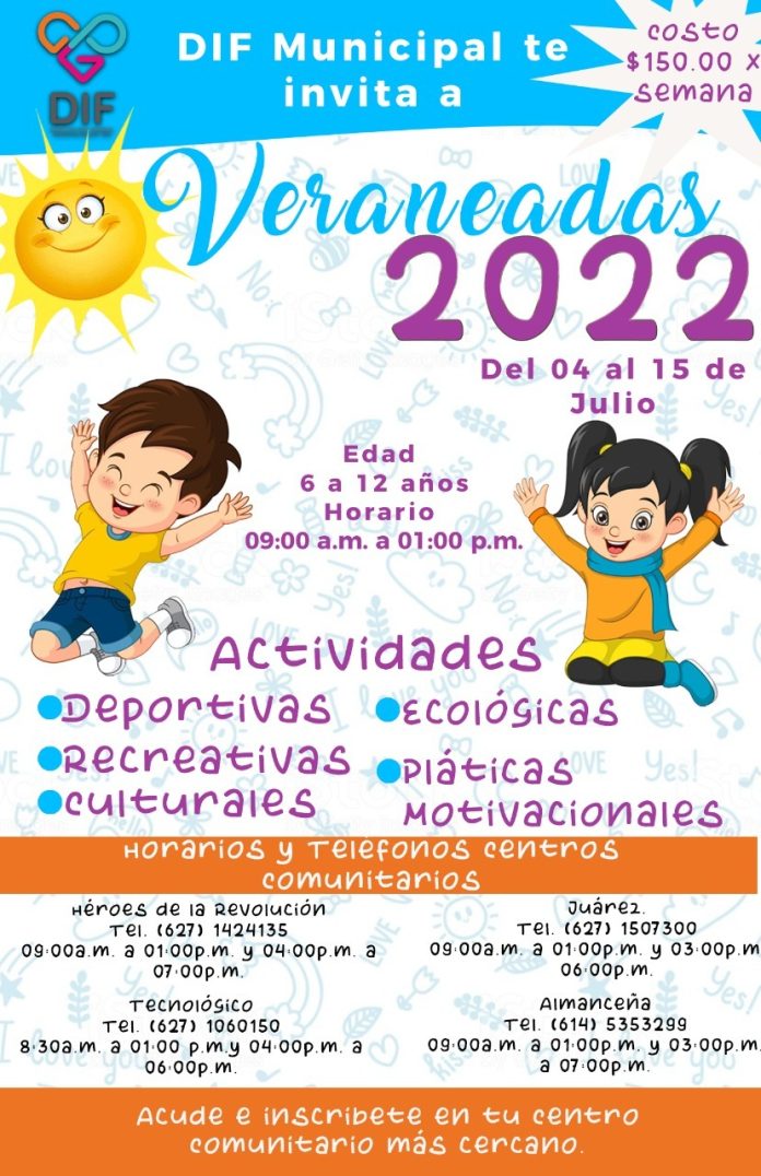 Del 4 al 15 de julio, el DIF Municipal a través de los Centros Comunitarios invita a los padres de familia a inscribir a sus hijos en las “Veraneadas 2022” donde podrán divertirse y disfrutar de sus vacaciones.