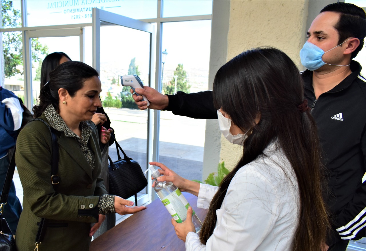 Hidalgo del Parral, Chih. – La primera de las acciones se aplicó esta mañana, con la instalación de un filtro de toma de temperatura y aplicación de gel antibacterial a las personas que ingresan a la Presidencia Municipal, incluido el personal de la dependencia.