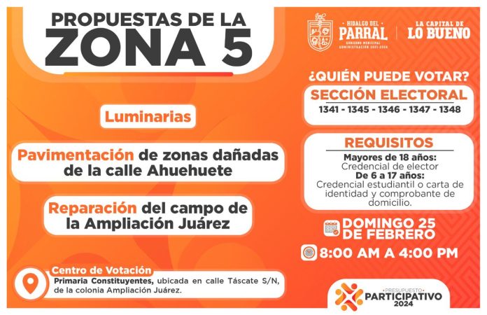 La hora de decidir ha llegado, el próximo domingo 25 de febrero se llevará a cabo la votación del Presupuesto Participativo 2024 y aquí te presentamos las obras finalistas de la *Zona 5,* con el fin de que acudas y votes por la que más beneficio genere a tu entorno.
