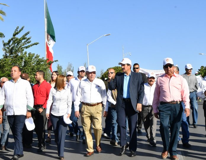 Chihuahua, Chih. – El gobernador de Chihuahua, Javier Corral Jurado y funcionarios de su gabinete participaron junto a trabajadores, dirigentes sindicales y legisladores en el Desfile del Día del Trabajo 2019.