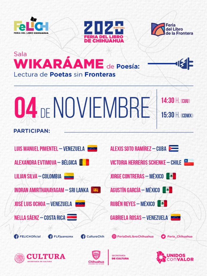 Chihuahua, Chih. – En la recta final de su programación, la Feria del Libro de Chihuahua (Felich) 2020, invita a disfrutar de la poesía en voz de representantes ocho países diferentes con la lectura virtual “Poetas sin Fronteras”, que se transmitirá a través de Facebook el miércoles 4 de noviembre en punto de las 14:30 horas.