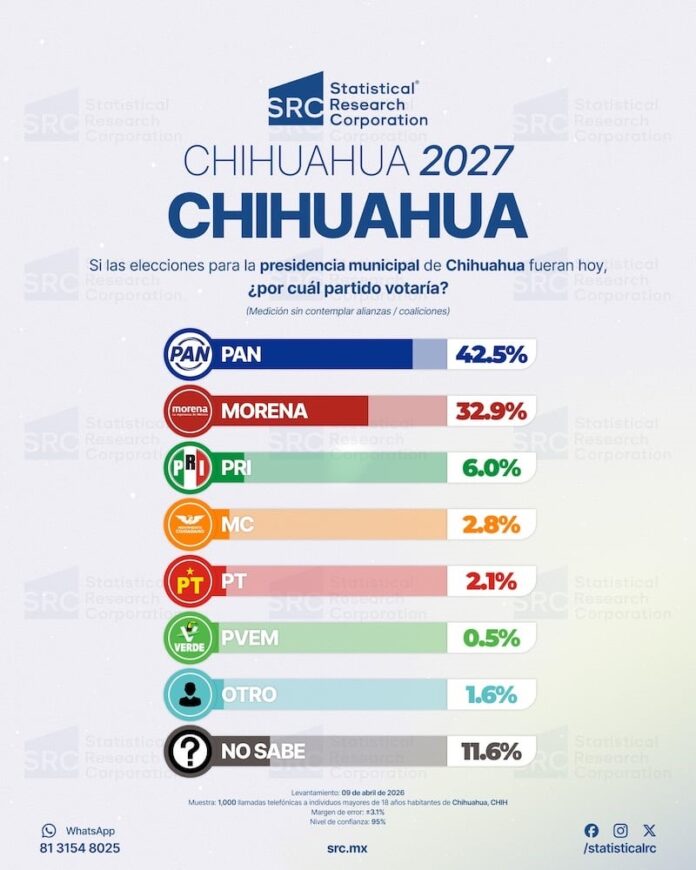 Ciudad Juárez, Chih. (ADN/Arturo Hernández) – Diversos ejercicios demoscópicos colocan a Morena con ventaja en la intención de voto rumbo a la gubernatura de Chihuahua en 2027, mientras que el Partido Acción Nacional (PAN) se mantiene como principal fuerza opositora en un escenario que aún permanece en evolución.