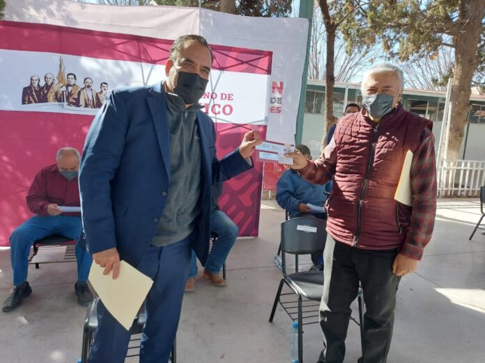 Meoqui, Chih. (ADN / Martín Orquiz) – Beneficiarios de distintos programas de Bienestar en Meoqui, recibieron los apoyos a los que tienen derecho en un acto que encabezó el delegado estatal de los Programas para el Desarrollo, Juan Carlos Loera de la Rosa, durante una gira por el sur del estado.