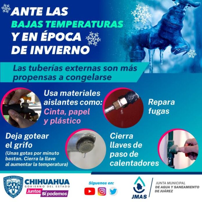 Ante los frentes fríos que se presentan en la entidad, la Junta Municipal de Agua y Saneamiento (JMAS) Juárez, como parte de la campaña “Juntos Evitemos el Desperdicio de Agua”, invita a usuarias y usuarios a proteger las tuberías externas de agua de sus viviendas y negocios, con el fin de evitar rupturas que pudieran ocasionar fugas y desperdicio del vital líquido.