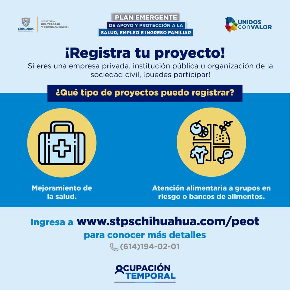 El proceso de registro es muy sencillo, se deberá ingresar a la página www.stpschihuahua.com/peot y una vez realizada la inscripción, personal de la STPS, se pondrá en contacto con los interesados para dar seguimiento a su proyecto, comentó.