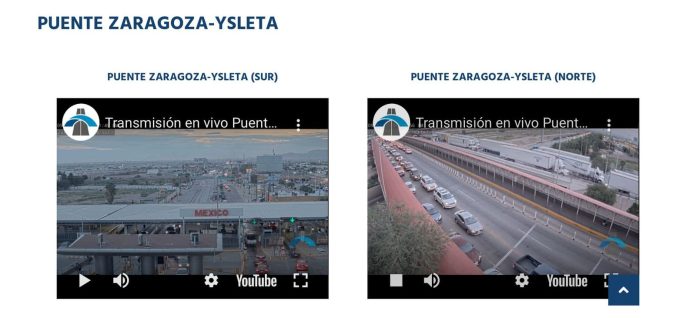 Ciudad Juárez, Chih .- A través del Fideicomiso de Puentes Fronterizos de Chihuahua (FPFCH) el Gobierno del Estado instaló un sistema de videocámaras en exteriores para transmitir en vivo, en los cruces fronterizos de los puentes internacionales Paso del Norte, Lerdo Línea Exprés y Zaragoza, y que podrán consultar los usuarios de manera gratuita a través de la pagina digital oficial del Fideicomiso, https://www.puentesfronterizos.gob.mx/camaras-en-vivo.php.