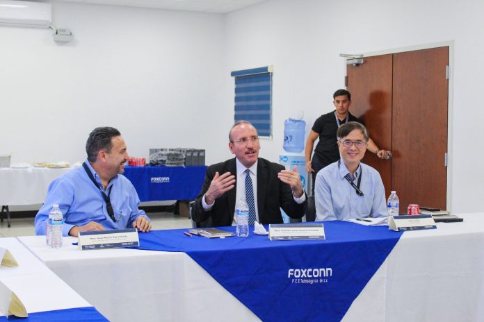 Ciudad Juárez, Chih .- Con el objetivo de ampliar el alcance del modelo de educación dual, autoridades de la Secretaría de Innovación y Desarrollo Económico (SIDE), y de la Secretaría de Educación y Deporte (SEyD), se reunieron con directivos de la empresa Foxconn en Ciudad Juárez.