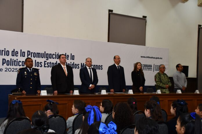 El evento también incluyó la interpretación del Himno de México, el Himno de Chihuahua y el Himno a la Constitución, a cargo de un coro de la escuela “Porfirio Parra” y la Banda de Música del Gobierno del Estado de Chihuahua.