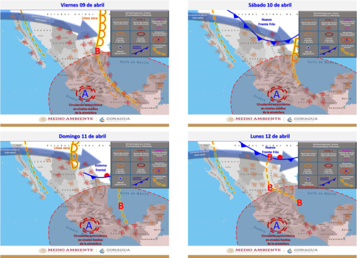 Finalmente, el pronóstico para el lunes 12 de abril, con motivo de la presencia de un canal de baja presión en interacción con la corriente en chorro y la aproximación de un nuevo frente frío (posible número 50) podría generar un ambiente de frío a fresco por la mañana y caluroso por la tarde, con un cielo casi despejado.