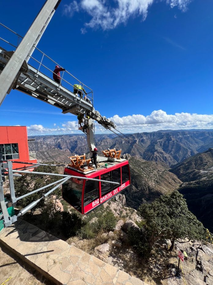 Chihuahua, Chih .- Gobierno del Estado, a través de Promotora de Símbolos Ah Chihuahua, descentralizado de la Secretaría de Turismo, llevaron a cabo con la empresa austríaca Doppelmayr, el mantenimiento mayor a la infraestructura del teleférico ubicado en el Parque de Aventura Barrancas del Cobre (PABC).