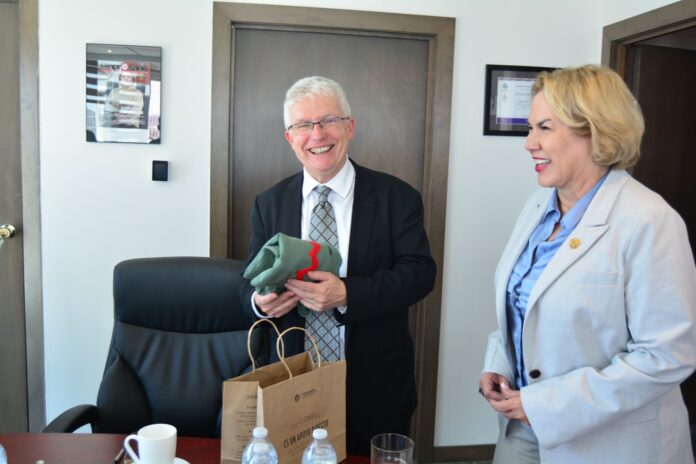 Chihuahua, Chih. (ADN/Staff) – El H. Congreso del estado de Chihuahua recibió la visita del Cónsul de Estados Unidos en Ciudad Juárez, Rafael Foley, el 26 de junio de 2024. El encuentro tuvo como objetivo establecer un diálogo sobre temas de interés mutuo, incluyendo la migración, la industria maquiladora, la seguridad y las relaciones comerciales, según informó la diputada presidenta Adriana Terrazas Porras.