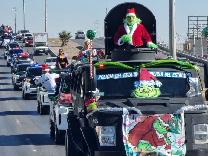 Los elementos de la Policía del Estado de Zona Norte decoraron las unidades con temáticas navideñas, se vistieron de superhéroes y personajes como El Grinch y Santa Claus y salieron a las principales calles y avenidas de Juárez.