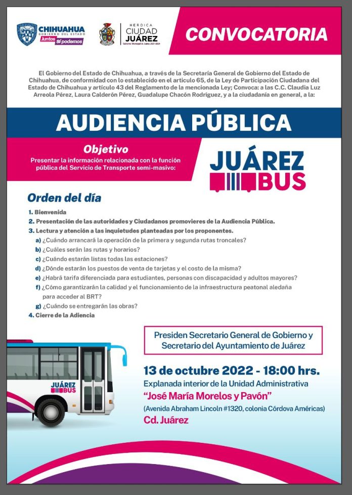 Ciudad Juárez, Chih .- El Gobierno del Estado, a través de la Secretaría General de Gobierno y el Municipio de Juárez, por medio de la Secretaría del Ayuntamiento, realizarán el jueves 13 de octubre una audiencia pública en las instalaciones del Pueblito Mexicano, para informar sobre aspectos importantes de la ruta Troncal 2 del Juárez Bus.