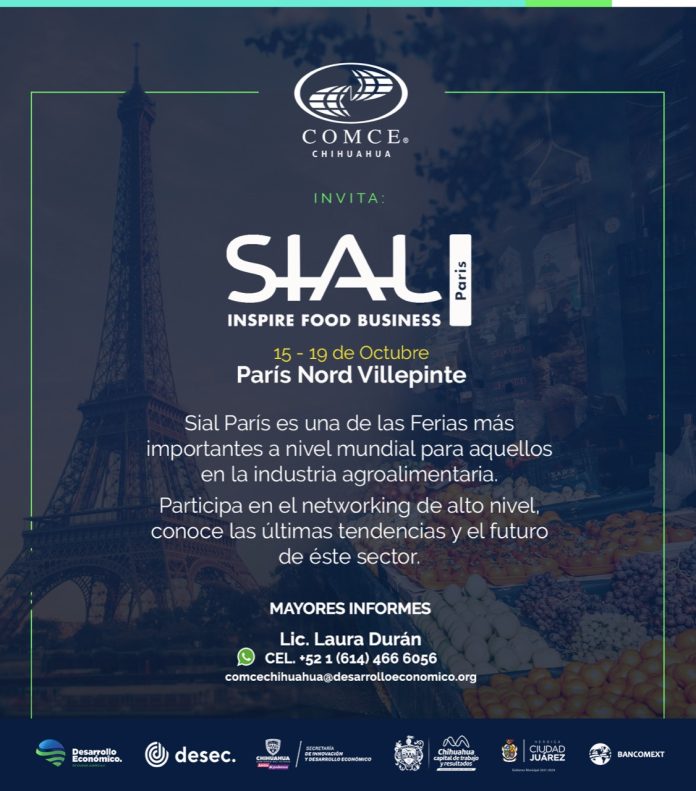 Chihuahua, Chih .- La Secretaría de Innovación y Desarrollo Económico, en alianza con el Consejo Mexicano de Comercio Exterior de Chihuahua (COMCE), Desarrollo Económico del Estado de Chihuahua (DESEC), Desarrollo Económico de Ciudad Juárez (DECJ), Bancomext y los municipios de Ciudad Juárez y Chihuahua, invitan a empresas chihuahuenses a participar en SIAL Paris 2022, una de las ferias de la industria agroalimentaria más importantes en el mundo.